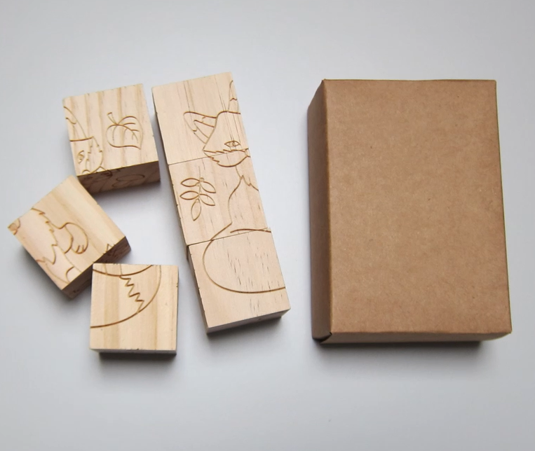 Drewniana układanka. Tradycyjna zabawka edukacyjna dla dzieci. Zestaw składa się z 6 klocków oraz sześciu obrazków do ułożenia, przedstawiających zwierzęta leśne.